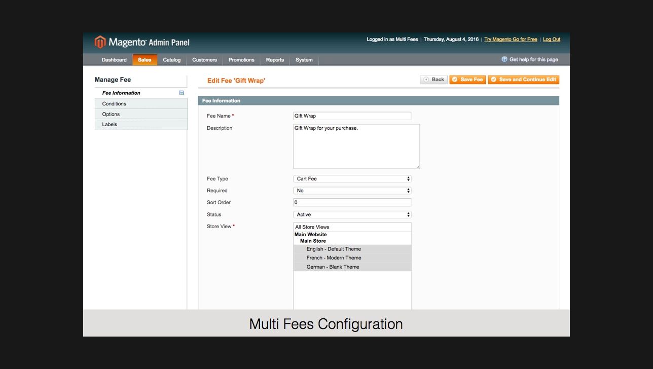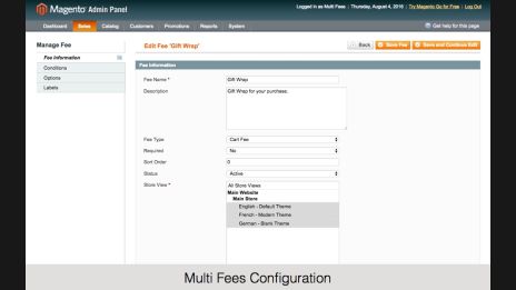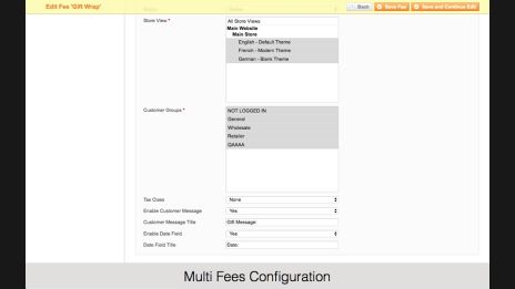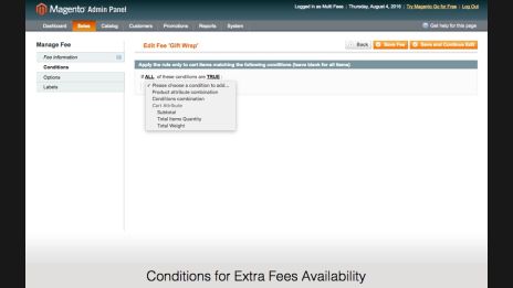 Add extra fees based on various conditions or their combinations. With this extension you can add product fee conditions based on: