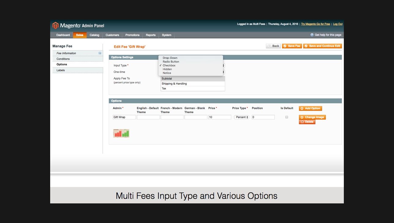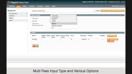 Display extra fees in one of the 5 input type positions: a drop-down, a checkbox, a radio button, hidden and a notice.