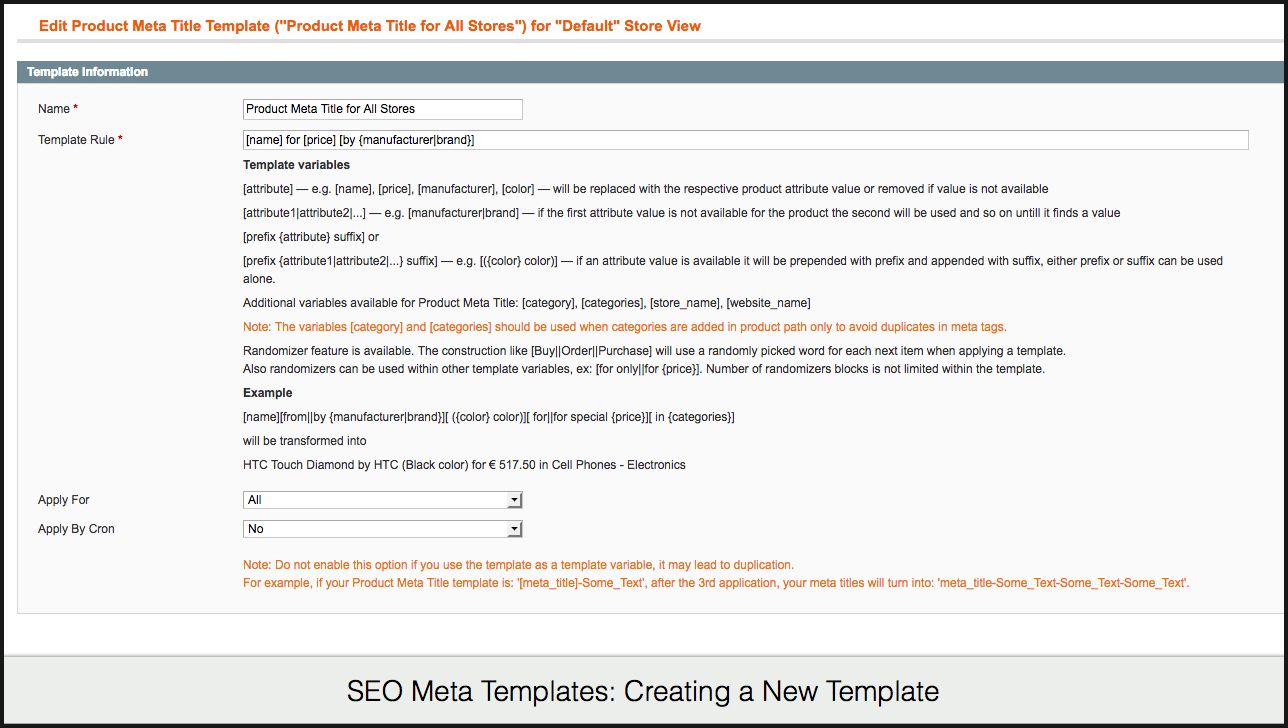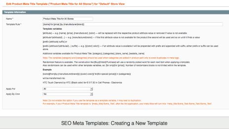Category Templates will help you automatically optimize an unlimited number of category meta titles, meta descriptions, meta keywords and full category descriptions.SEO Suite Ultimate Category Templates can be assigned by: