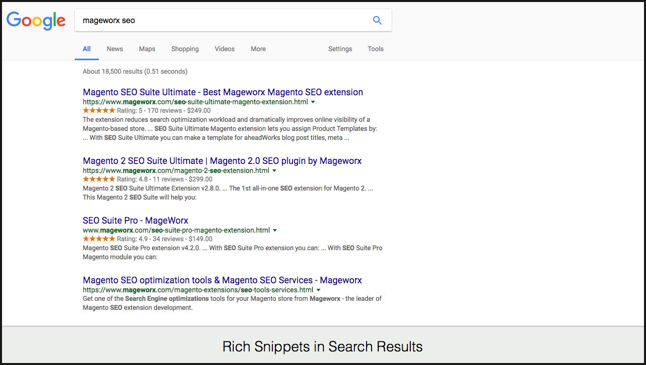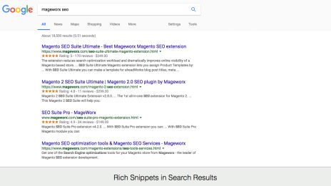 Add markup tags to help search engines better understand what your site pages are about. Thus, for each page they'll deliver more informative results that will have a preview image, product rating, price, availability, and dozens of other important details, such as: