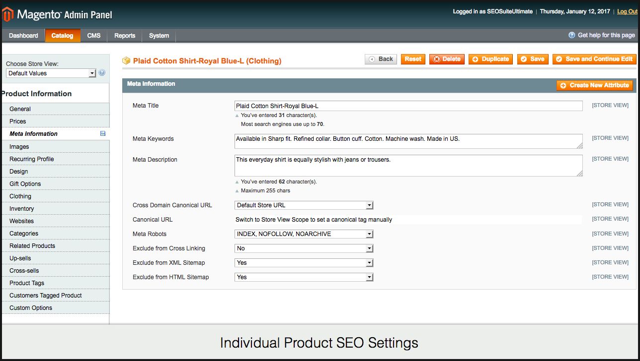 SEO Suite Ultimate extension generates comprehensive onpage SEO reports that let you detect and cure: pages with long meta title and meta description tags, pages that have duplicate meta title and meta description tags, pages with empty meta tags, and more. Available for products, categories and CMS pages.
