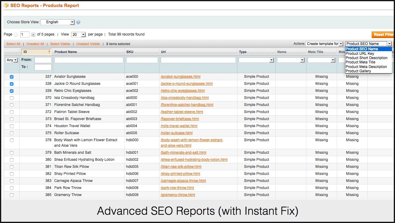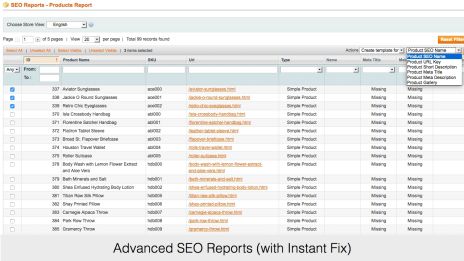 Also, right from this grid, you can select products with duplicated or missing data, and fix them on the fly by creating new templates with unique SEO values.